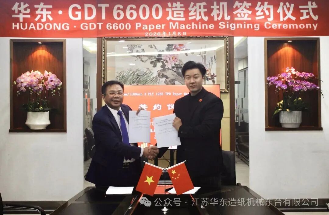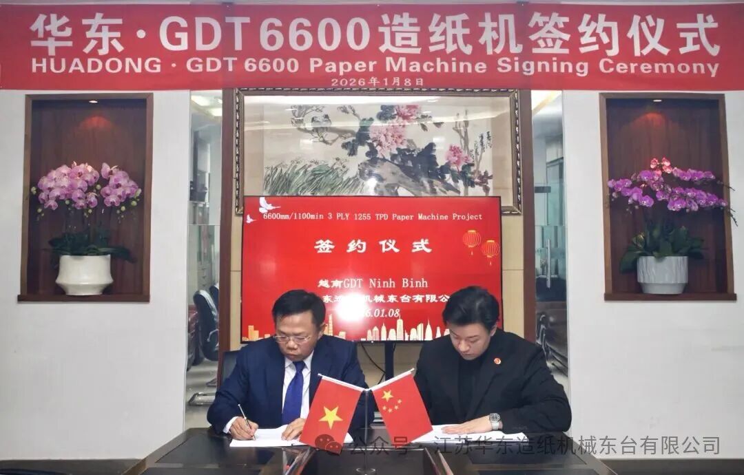 At the beginning of the new year in 2026, Jiangsu Huadong Paper Machinery and Vietnam GDT Group officially signed a supply contract for the GDT Ninh Binh 6600 mm/1100 m/min 3-PLY 1255 TPD paper machine project. Both PM1 and PM2 production lines of GDT Group have chosen Huadong as the general contractor for the paper machine section. The consistent choice of customers in consecutive projects reflects their full trust and recognition of Huadong 's technical solutions, engineering capabilities, and project execution level, as well as the long-term recognition of Huadong 's comprehensive strength in the field of large-scale high-speed paper machines in overseas markets.